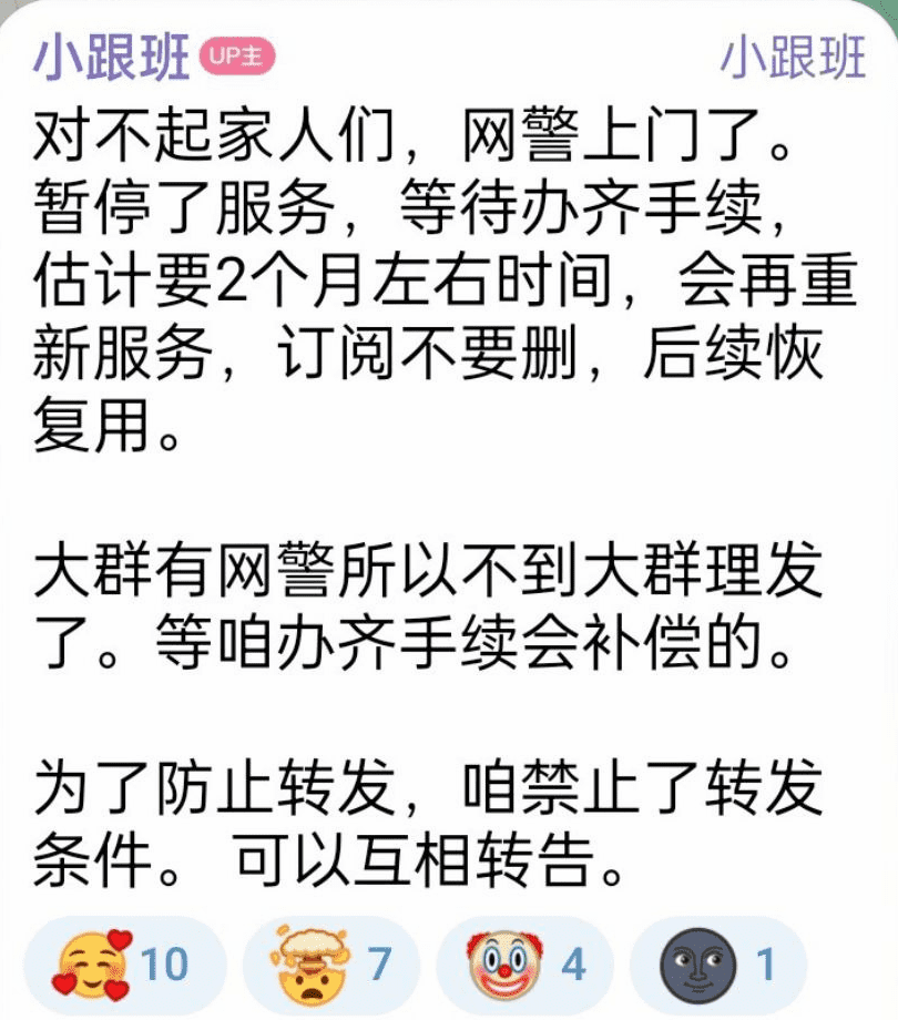 对不起家人们,网警上门了。暂停了服务,等待办齐手续,估计要2个月左右时间,会再重新服务,订阅不要删,后续恢复用。大群有网警所以不到大群理发了。等咱办齐手续会补偿的。为了防止转发,咱禁止了转发条件。可以互相转告。