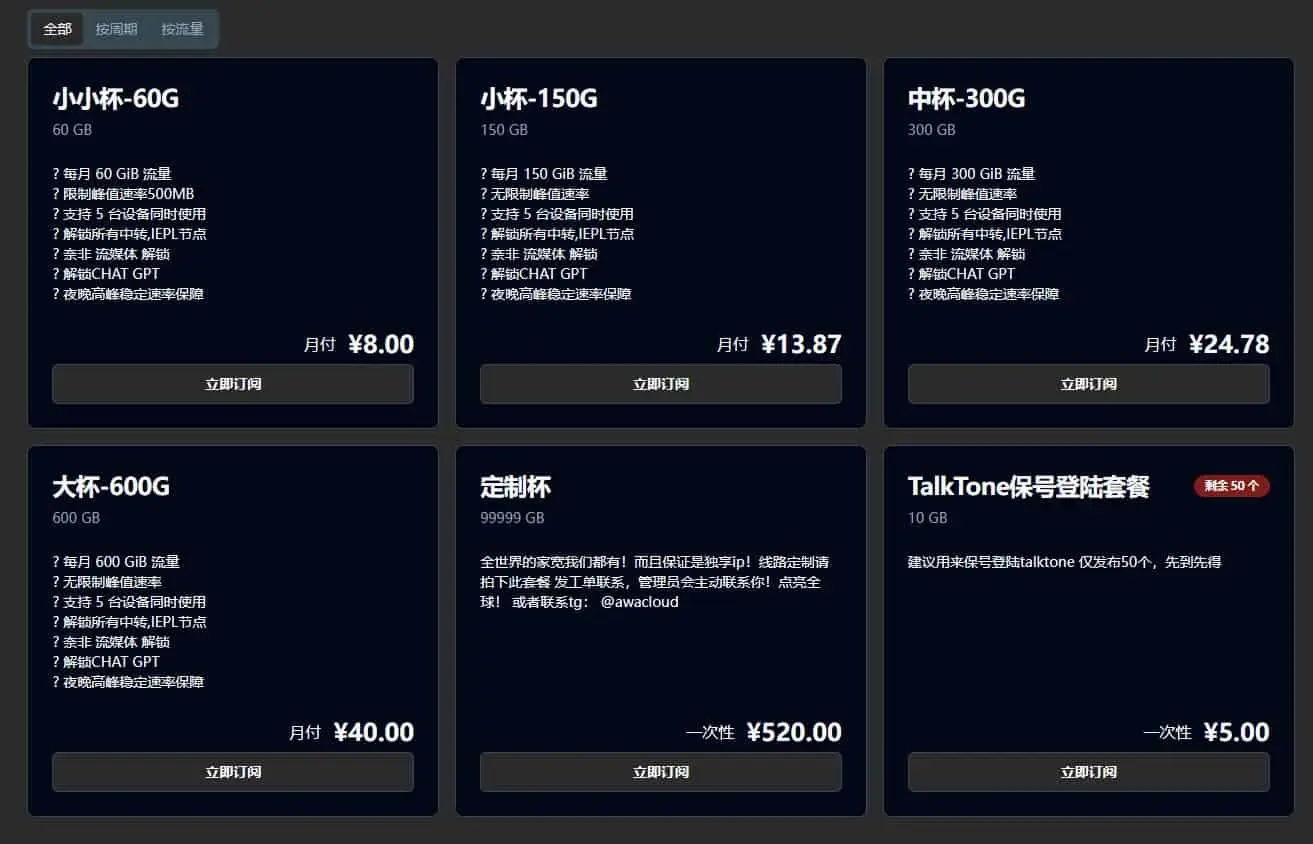 中转+专线机场,包含游戏专线,香港专线,晚高峰支持超清8K,解锁流媒体,支持ChatGPT,Tiktok解锁,优惠活动: 白嫖200G,白嫖码群组内获取,年付八折,全场九……