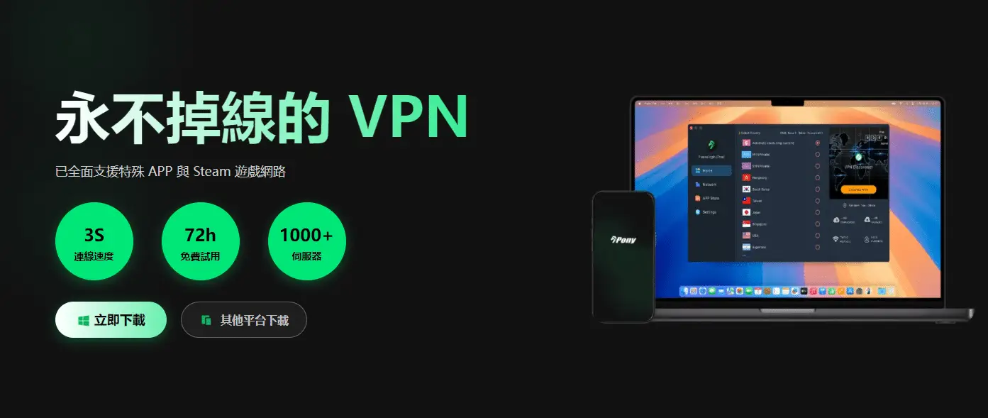 永不掉线的VPN,已全面支持特殊APP与Steam游戏网络,1000+3S连线速度 免费服务器72小时使用!!