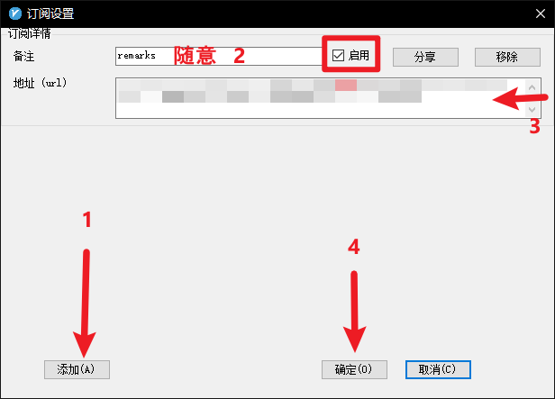 新加一个订阅,然后黏贴你的订阅链接并点击确定